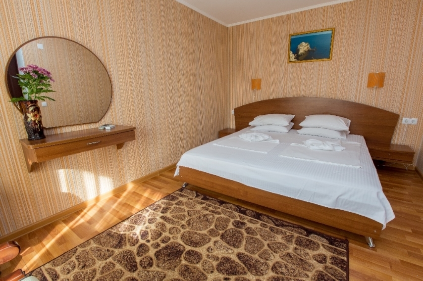 В номере: одна двуспальная кровать (1,8*2 м), прикроватные тумбочки, два кресла, журнальный столик, стул, туалетный стол и зеркало, шкаф, настенное зеркало, вешалка.
