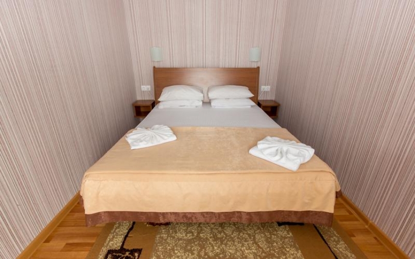 В номере: две односпальные кровати (0,9*2 м), которые можно совместить в одну, прикроватные тумбочки, кресло-кровать, журнальный столик, стул, туалетный стол и зеркало, шкаф, настенное зеркало, вешалка.